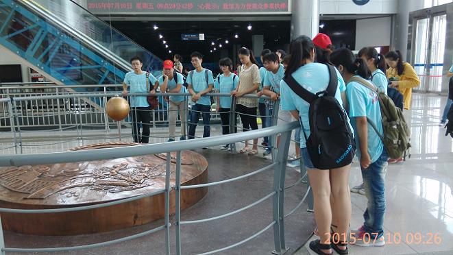 上午8点,队员们在科技馆集合,映入眼帘的是高线悬挂的铜质傅科摆,这是法国物理学家傅科进行的一次成功的摆动试验模型,可证明地球在无时无刻的自转。随后,科技馆的吕导游热情满满地接待大家,一边带领队员们参观一边仔细认真地讲解,其中包括令人叹为观止的机器人、技术精湛的坦克模型、酷炫时尚的奇瑞车型及新兴科技的3D打印等。队员们兴致勃勃,乐在其中。参观结束,队员进入进行自由活动时间,可以细致的参观了解自己感兴趣的地方。